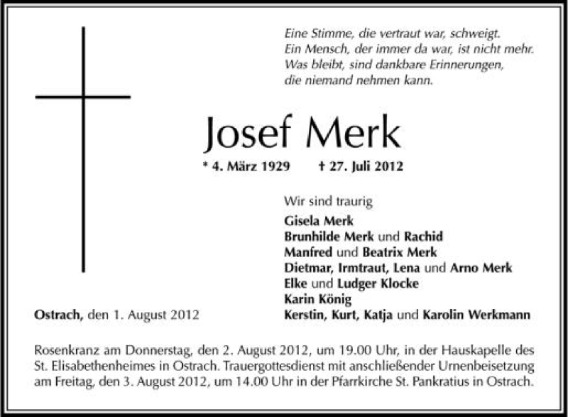 Hier finden Sie alle Traueranzeigen aus der Zeitung, die bisher für Josef Merk erschienen sind. Weitere Traueranzeigen, die in der Zeitung erscheinen, werden hier ebenfalls aufgelistet