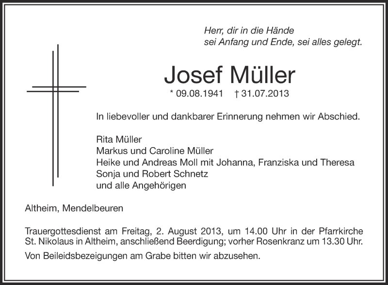 Hier finden Sie alle Traueranzeigen aus der Zeitung, die bisher für Josef Müller erschienen sind. Weitere Traueranzeigen, die in der Zeitung erscheinen, werden hier ebenfalls aufgelistet
