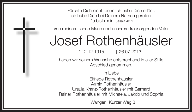 Hier finden Sie alle Traueranzeigen aus der Zeitung, die bisher für Josef Rothenhäusler erschienen sind. Weitere Traueranzeigen, die in der Zeitung erscheinen, werden hier ebenfalls aufgelistet