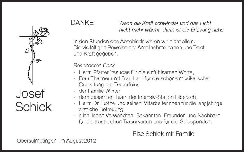 Hier finden Sie alle Traueranzeigen aus der Zeitung, die bisher für Josef Schick erschienen sind. Weitere Traueranzeigen, die in der Zeitung erscheinen, werden hier ebenfalls aufgelistet