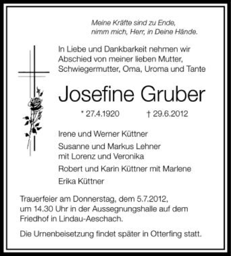 Hier finden Sie alle Traueranzeigen aus der Zeitung, die bisher für Josefine Gruber erschienen sind. Weitere Traueranzeigen, die in der Zeitung erscheinen, werden hier ebenfalls aufgelistet