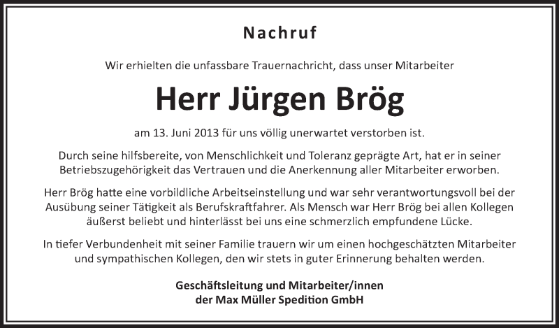 Hier finden Sie alle Traueranzeigen aus der Zeitung, die bisher für Jürgen Brög erschienen sind. Weitere Traueranzeigen, die in der Zeitung erscheinen, werden hier ebenfalls aufgelistet