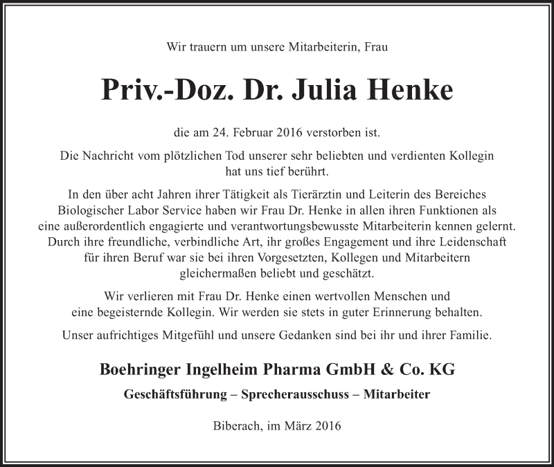 Hier finden Sie alle Traueranzeigen aus der Zeitung, die bisher für Julia Henke erschienen sind. Weitere Traueranzeigen, die in der Zeitung erscheinen, werden hier ebenfalls aufgelistet