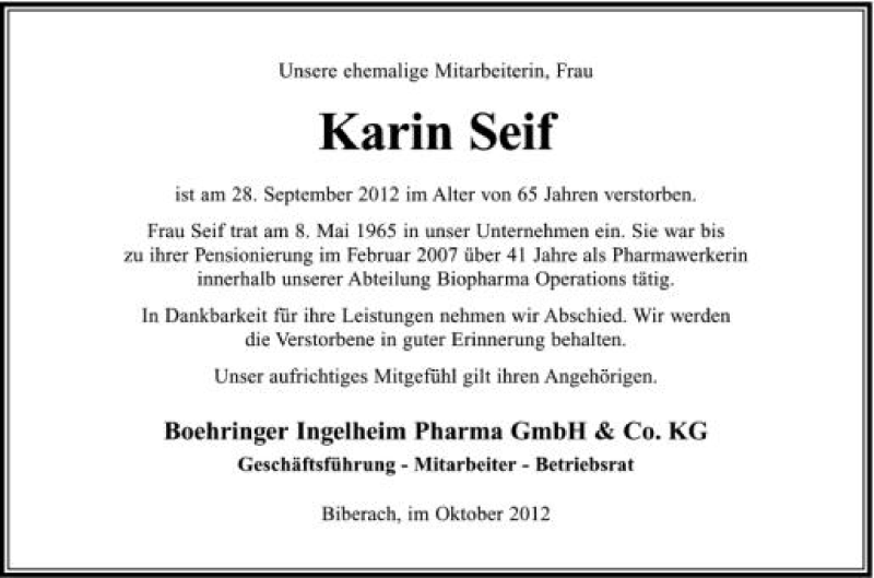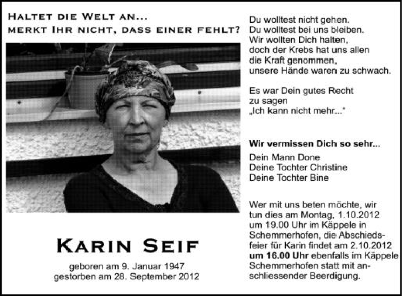 Hier finden Sie alle Traueranzeigen aus der Zeitung, die bisher für Karin Seif erschienen sind. Weitere Traueranzeigen, die in der Zeitung erscheinen, werden hier ebenfalls aufgelistet