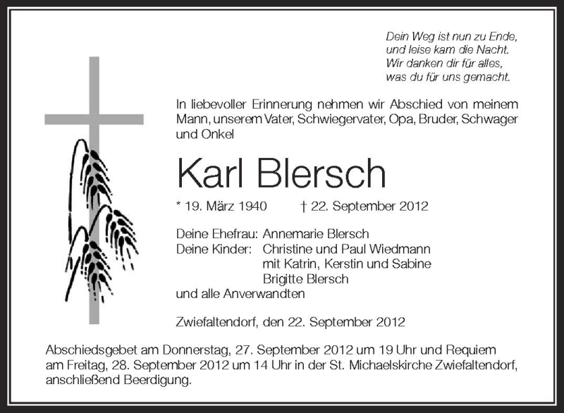 Hier finden Sie alle Traueranzeigen aus der Zeitung, die bisher für Karl Blersch erschienen sind. Weitere Traueranzeigen, die in der Zeitung erscheinen, werden hier ebenfalls aufgelistet
