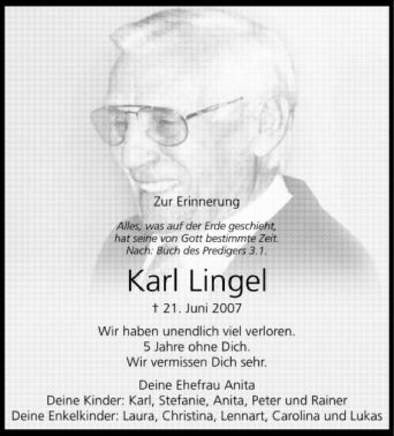 Hier finden Sie alle Traueranzeigen aus der Zeitung, die bisher für Karl Lingel erschienen sind. Weitere Traueranzeigen, die in der Zeitung erscheinen, werden hier ebenfalls aufgelistet