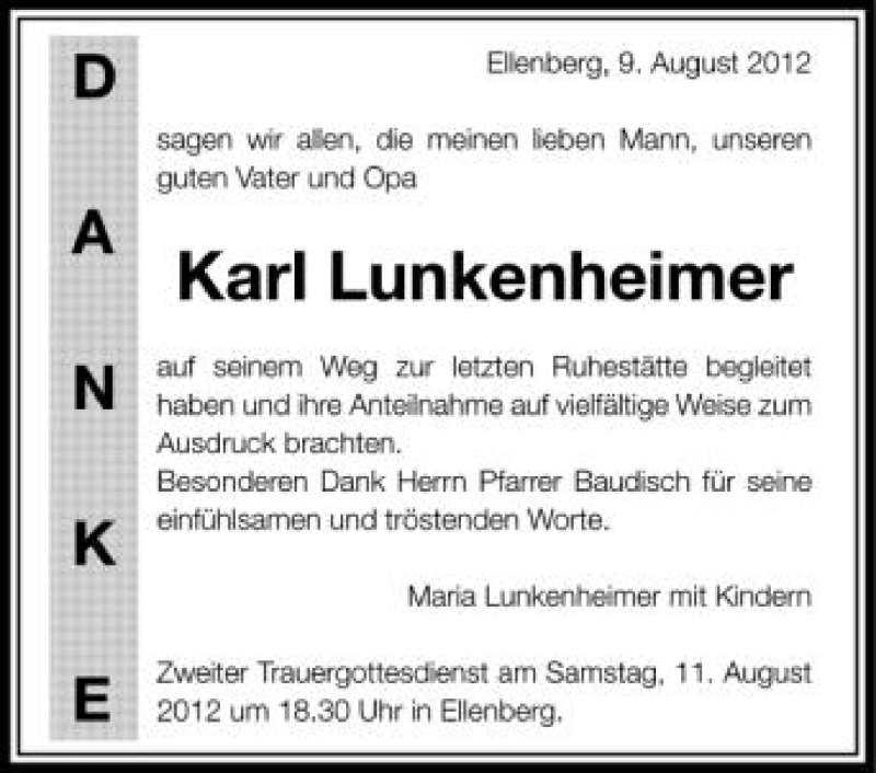 Hier finden Sie alle Traueranzeigen aus der Zeitung, die bisher für Karl Lunkenheimer erschienen sind. Weitere Traueranzeigen, die in der Zeitung erscheinen, werden hier ebenfalls aufgelistet