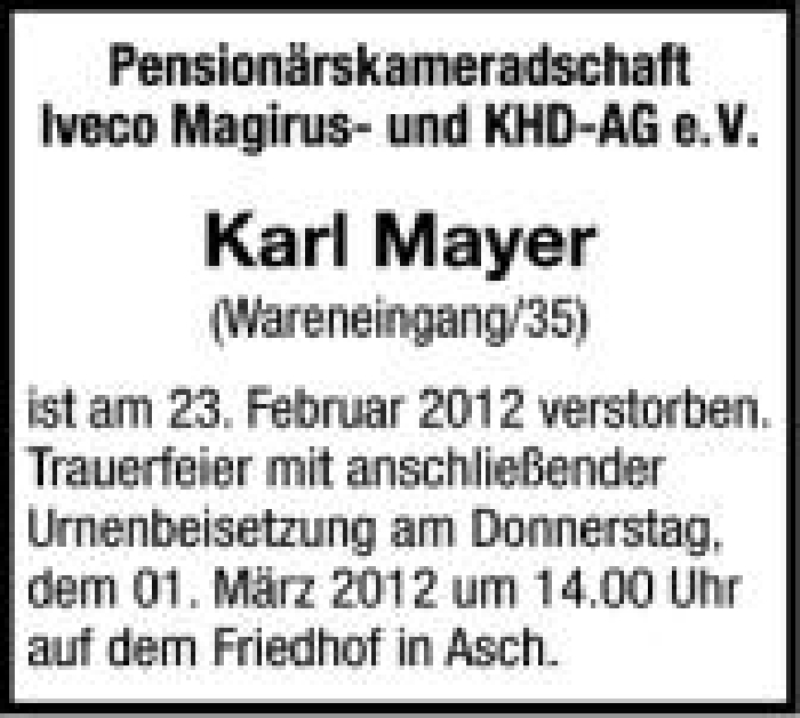 Hier finden Sie alle Traueranzeigen aus der Zeitung, die bisher für Karl Mayer erschienen sind. Weitere Traueranzeigen, die in der Zeitung erscheinen, werden hier ebenfalls aufgelistet
