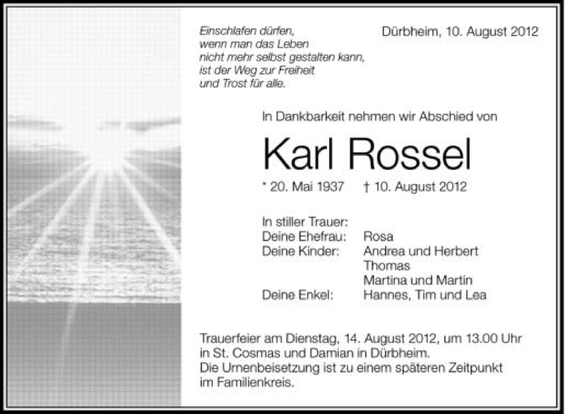 Hier finden Sie alle Traueranzeigen aus der Zeitung, die bisher für Karl Rossel erschienen sind. Weitere Traueranzeigen, die in der Zeitung erscheinen, werden hier ebenfalls aufgelistet