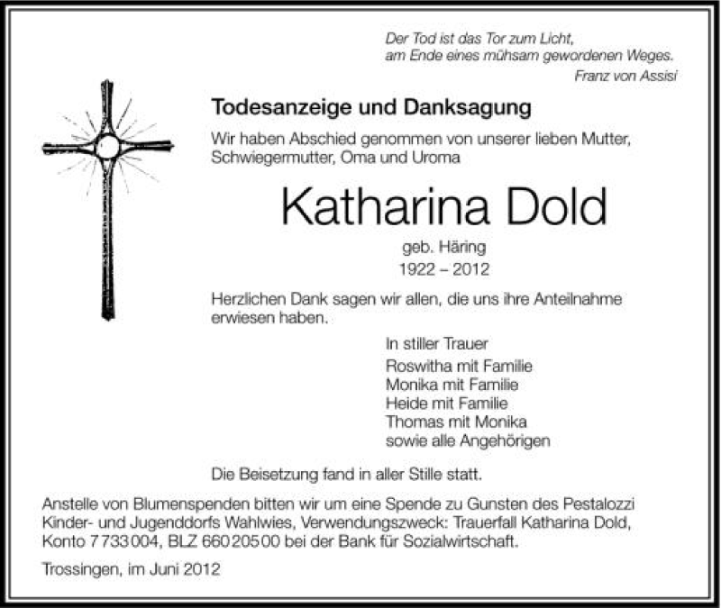 Hier finden Sie alle Traueranzeigen aus der Zeitung, die bisher für Katharina Dold erschienen sind. Weitere Traueranzeigen, die in der Zeitung erscheinen, werden hier ebenfalls aufgelistet