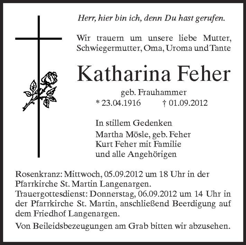 Hier finden Sie alle Traueranzeigen aus der Zeitung, die bisher für Katharina Feher erschienen sind. Weitere Traueranzeigen, die in der Zeitung erscheinen, werden hier ebenfalls aufgelistet