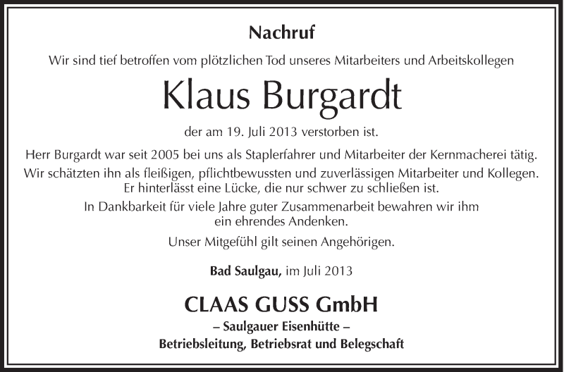 Hier finden Sie alle Traueranzeigen aus der Zeitung, die bisher für Klaus Burgardt erschienen sind. Weitere Traueranzeigen, die in der Zeitung erscheinen, werden hier ebenfalls aufgelistet