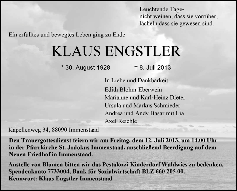 Hier finden Sie alle Traueranzeigen aus der Zeitung, die bisher für Klaus Engstler erschienen sind. Weitere Traueranzeigen, die in der Zeitung erscheinen, werden hier ebenfalls aufgelistet