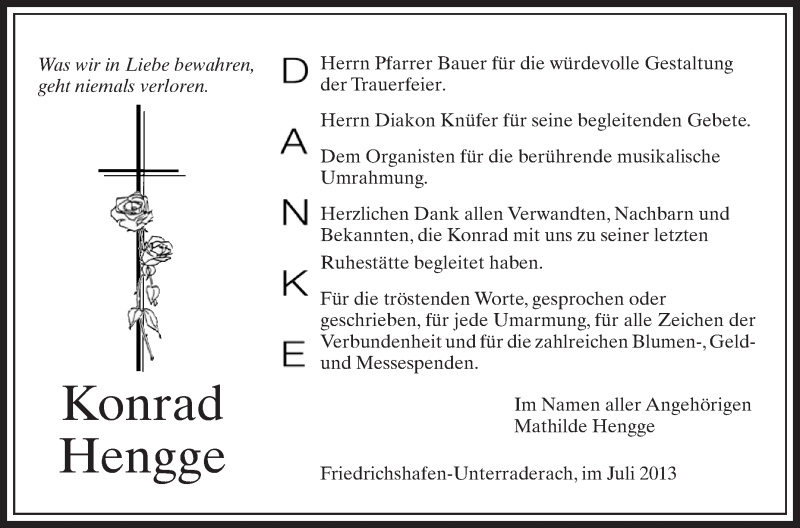 Hier finden Sie alle Traueranzeigen aus der Zeitung, die bisher für Konrad Hengge erschienen sind. Weitere Traueranzeigen, die in der Zeitung erscheinen, werden hier ebenfalls aufgelistet