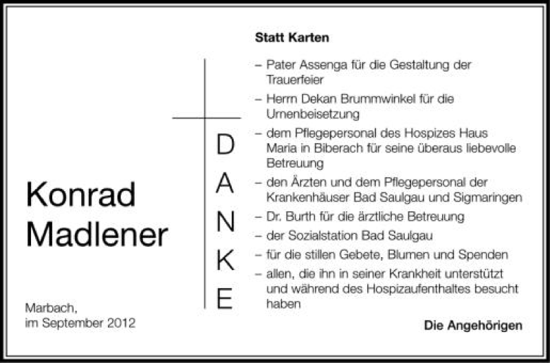 Hier finden Sie alle Traueranzeigen aus der Zeitung, die bisher für Konrad Madlener erschienen sind. Weitere Traueranzeigen, die in der Zeitung erscheinen, werden hier ebenfalls aufgelistet