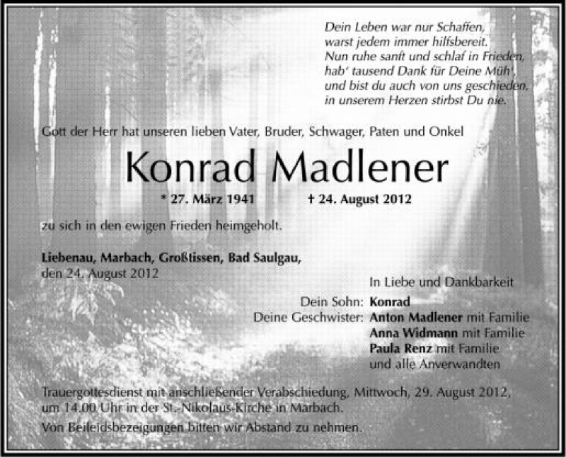 Hier finden Sie alle Traueranzeigen aus der Zeitung, die bisher für Konrad Madlener erschienen sind. Weitere Traueranzeigen, die in der Zeitung erscheinen, werden hier ebenfalls aufgelistet