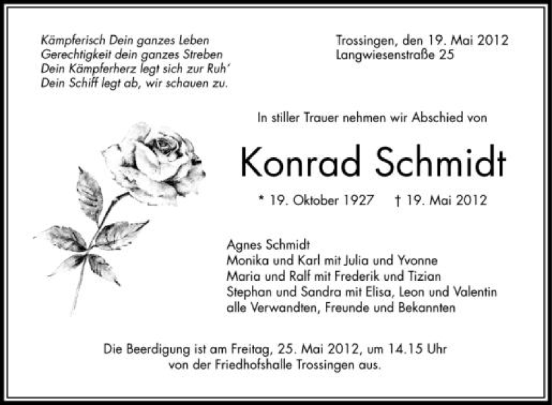 Hier finden Sie alle Traueranzeigen aus der Zeitung, die bisher für Konrad Schmidt erschienen sind. Weitere Traueranzeigen, die in der Zeitung erscheinen, werden hier ebenfalls aufgelistet