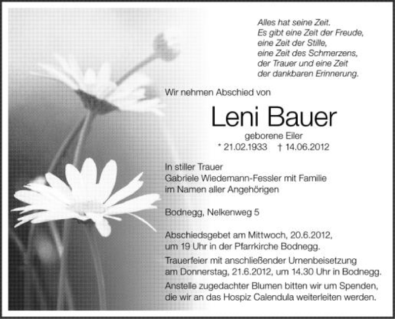 Hier finden Sie alle Traueranzeigen aus der Zeitung, die bisher für Leni Bauer erschienen sind. Weitere Traueranzeigen, die in der Zeitung erscheinen, werden hier ebenfalls aufgelistet
