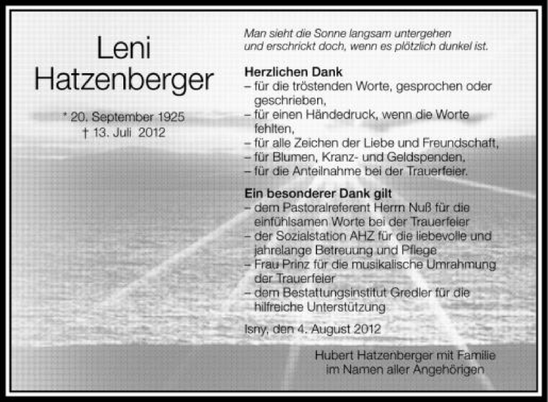 Hier finden Sie alle Traueranzeigen aus der Zeitung, die bisher für Leni Hatzenberger erschienen sind. Weitere Traueranzeigen, die in der Zeitung erscheinen, werden hier ebenfalls aufgelistet