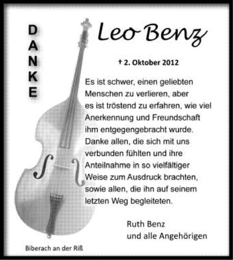 Hier finden Sie alle Traueranzeigen aus der Zeitung, die bisher für Leo Benz erschienen sind. Weitere Traueranzeigen, die in der Zeitung erscheinen, werden hier ebenfalls aufgelistet