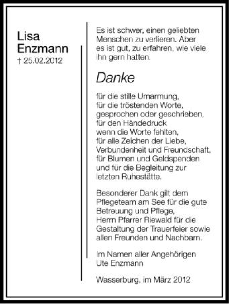 Hier finden Sie alle Traueranzeigen aus der Zeitung, die bisher für Lisa Enzmann erschienen sind. Weitere Traueranzeigen, die in der Zeitung erscheinen, werden hier ebenfalls aufgelistet