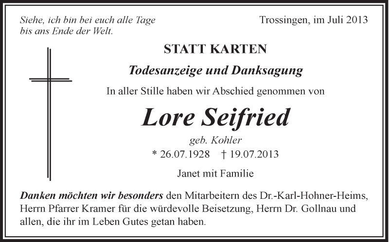 Hier finden Sie alle Traueranzeigen aus der Zeitung, die bisher für Lore Seifried erschienen sind. Weitere Traueranzeigen, die in der Zeitung erscheinen, werden hier ebenfalls aufgelistet
