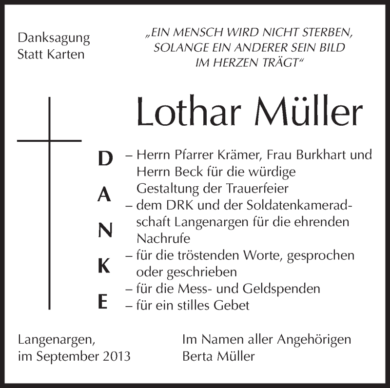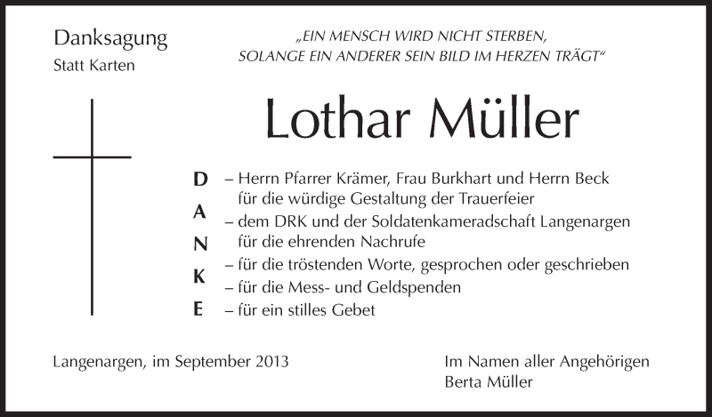 Hier finden Sie alle Traueranzeigen aus der Zeitung, die bisher für Lothar Müller erschienen sind. Weitere Traueranzeigen, die in der Zeitung erscheinen, werden hier ebenfalls aufgelistet
