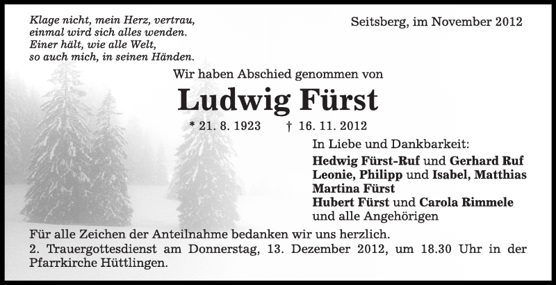 Hier finden Sie alle Traueranzeigen aus der Zeitung, die bisher für Ludwig Fürst erschienen sind. Weitere Traueranzeigen, die in der Zeitung erscheinen, werden hier ebenfalls aufgelistet