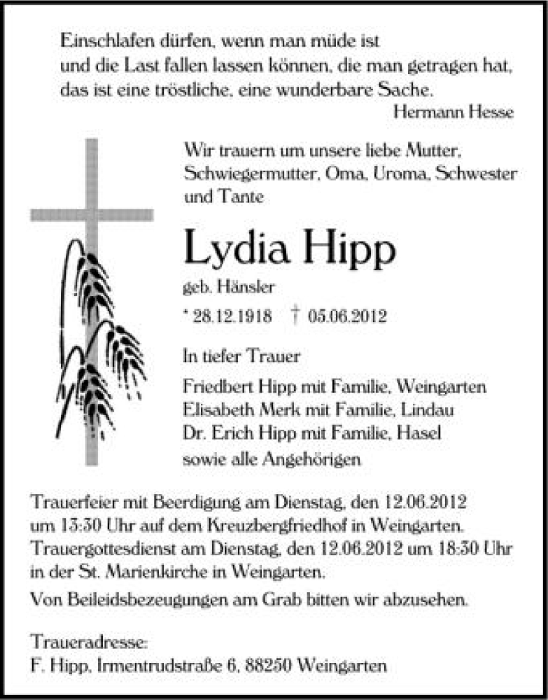 Hier finden Sie alle Traueranzeigen aus der Zeitung, die bisher für Lydia Hipp erschienen sind. Weitere Traueranzeigen, die in der Zeitung erscheinen, werden hier ebenfalls aufgelistet