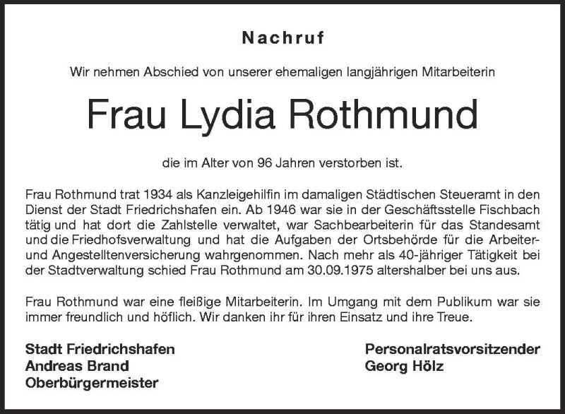 Hier finden Sie alle Traueranzeigen aus der Zeitung, die bisher für Lydia Rothmund erschienen sind. Weitere Traueranzeigen, die in der Zeitung erscheinen, werden hier ebenfalls aufgelistet