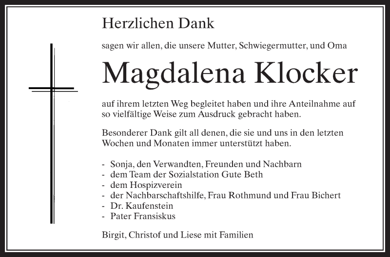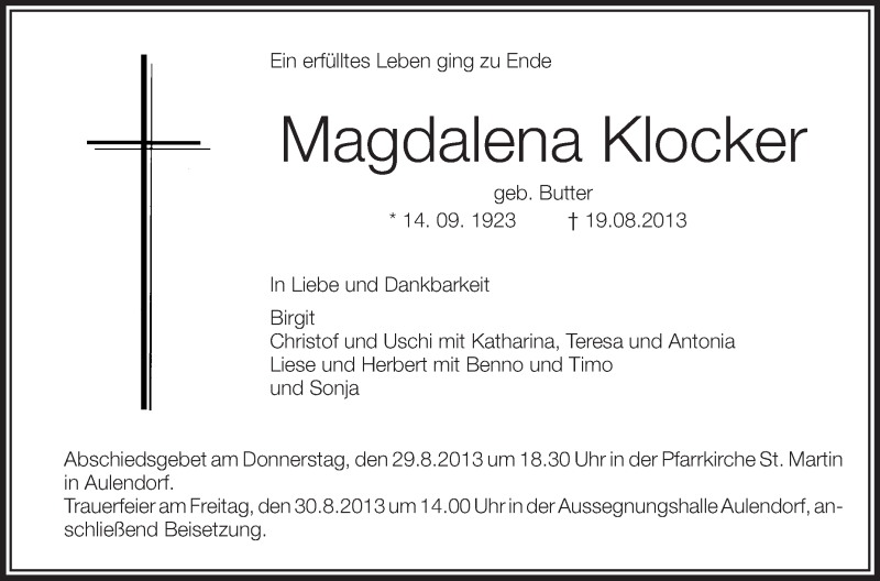 Hier finden Sie alle Traueranzeigen aus der Zeitung, die bisher für Magdalena Klocker erschienen sind. Weitere Traueranzeigen, die in der Zeitung erscheinen, werden hier ebenfalls aufgelistet
