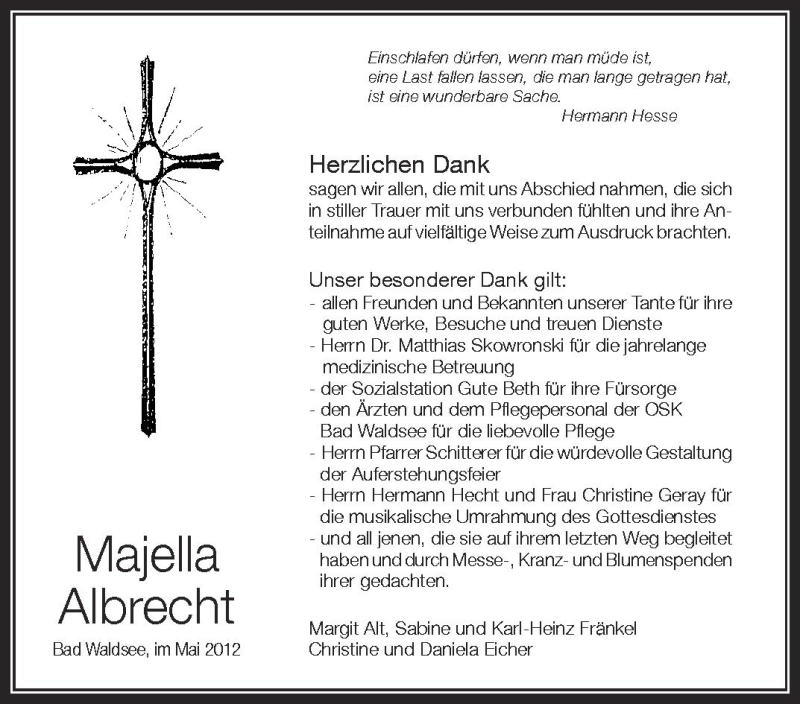 Hier finden Sie alle Traueranzeigen aus der Zeitung, die bisher für Majell Albrecht erschienen sind. Weitere Traueranzeigen, die in der Zeitung erscheinen, werden hier ebenfalls aufgelistet