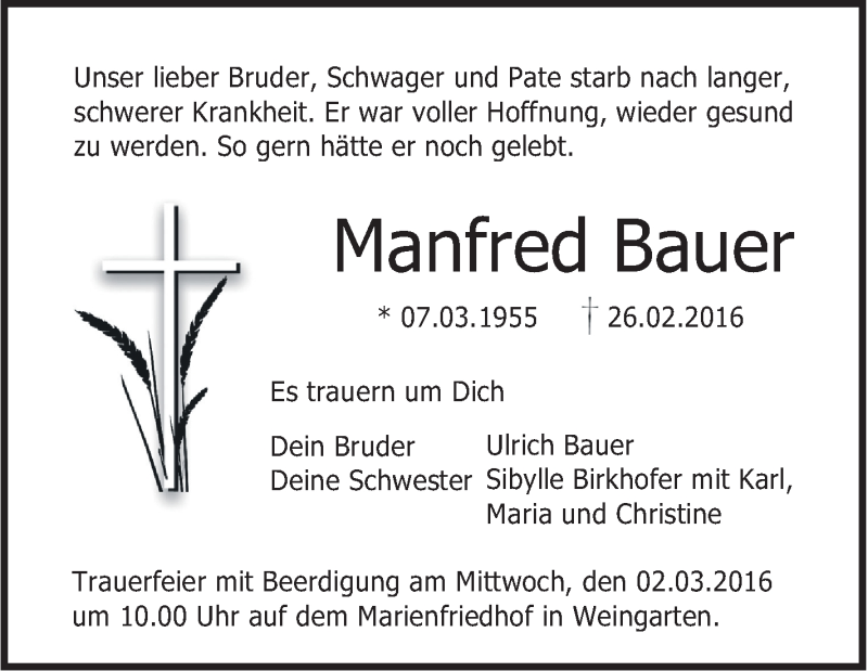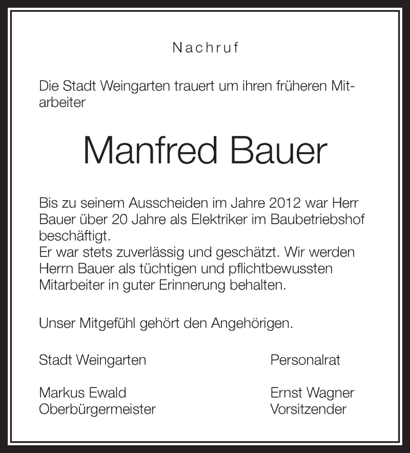 Hier finden Sie alle Traueranzeigen aus der Zeitung, die bisher für Manfred Bauer erschienen sind. Weitere Traueranzeigen, die in der Zeitung erscheinen, werden hier ebenfalls aufgelistet