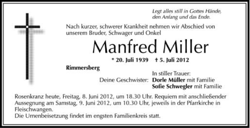 Hier finden Sie alle Traueranzeigen aus der Zeitung, die bisher für Manfred Miller erschienen sind. Weitere Traueranzeigen, die in der Zeitung erscheinen, werden hier ebenfalls aufgelistet