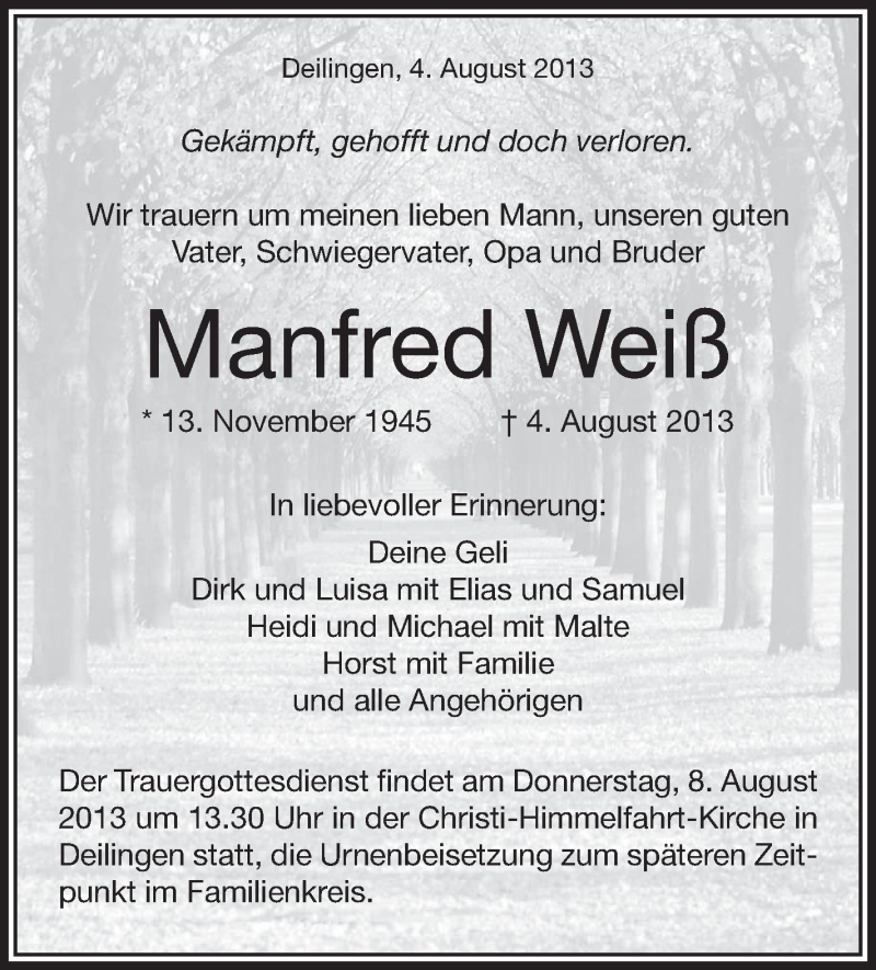 Hier finden Sie alle Traueranzeigen aus der Zeitung, die bisher für Manfred Weiß erschienen sind. Weitere Traueranzeigen, die in der Zeitung erscheinen, werden hier ebenfalls aufgelistet