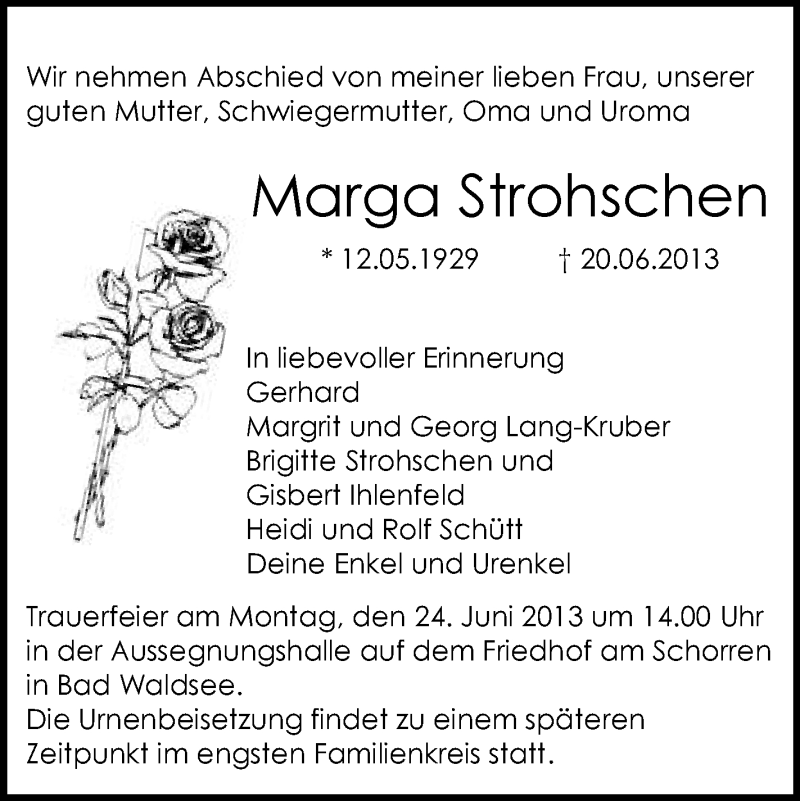 Hier finden Sie alle Traueranzeigen aus der Zeitung, die bisher für Marga Strohschen erschienen sind. Weitere Traueranzeigen, die in der Zeitung erscheinen, werden hier ebenfalls aufgelistet