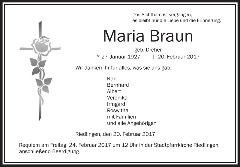 Hier finden Sie alle Traueranzeigen aus der Zeitung, die bisher für Maria Braun erschienen sind. Weitere Traueranzeigen, die in der Zeitung erscheinen, werden hier ebenfalls aufgelistet