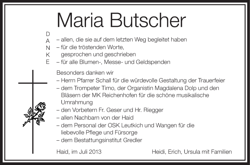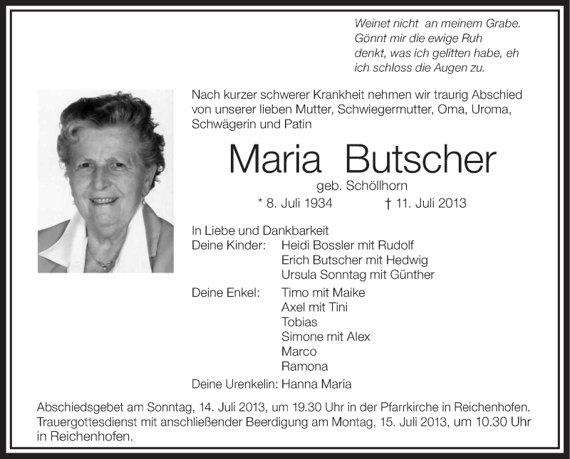 Hier finden Sie alle Traueranzeigen aus der Zeitung, die bisher für Maria Butscher erschienen sind. Weitere Traueranzeigen, die in der Zeitung erscheinen, werden hier ebenfalls aufgelistet