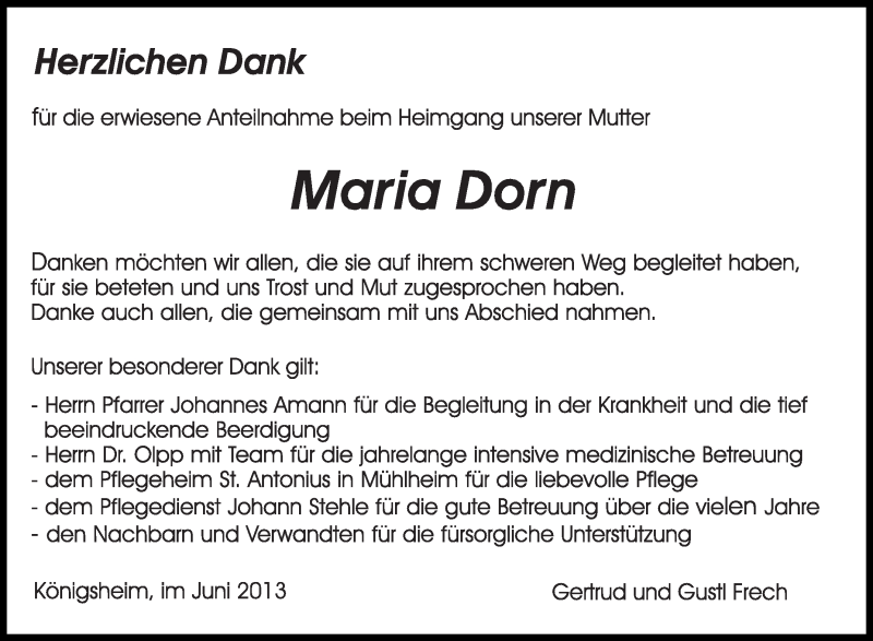 Hier finden Sie alle Traueranzeigen aus der Zeitung, die bisher für Maria Dorn erschienen sind. Weitere Traueranzeigen, die in der Zeitung erscheinen, werden hier ebenfalls aufgelistet
