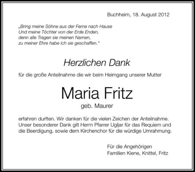 Hier finden Sie alle Traueranzeigen aus der Zeitung, die bisher für Maria Fritz erschienen sind. Weitere Traueranzeigen, die in der Zeitung erscheinen, werden hier ebenfalls aufgelistet