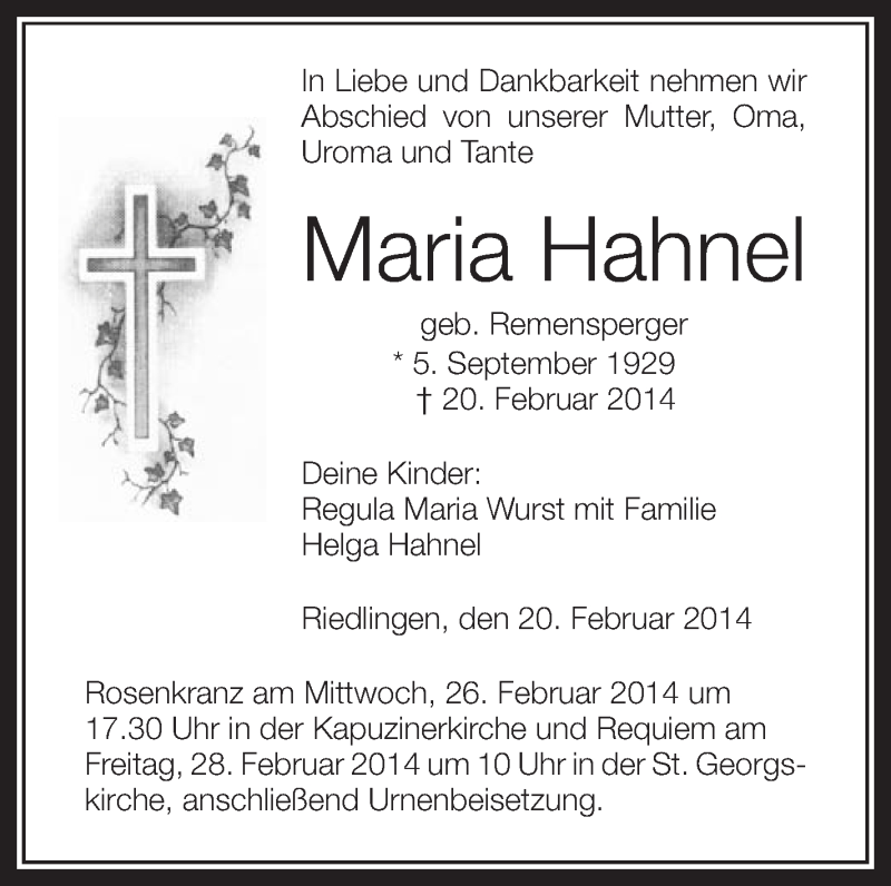 Hier finden Sie alle Traueranzeigen aus der Zeitung, die bisher für Maria Hahnel erschienen sind. Weitere Traueranzeigen, die in der Zeitung erscheinen, werden hier ebenfalls aufgelistet
