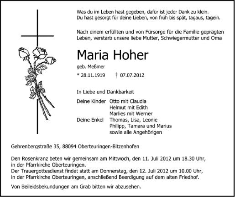 Hier finden Sie alle Traueranzeigen aus der Zeitung, die bisher für Maria Hoher erschienen sind. Weitere Traueranzeigen, die in der Zeitung erscheinen, werden hier ebenfalls aufgelistet