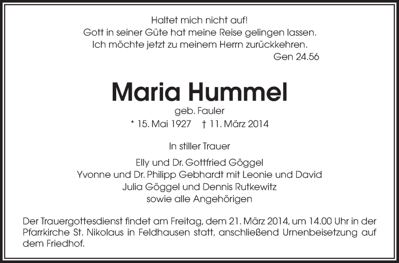 Hier finden Sie alle Traueranzeigen aus der Zeitung, die bisher für Maria Hummel erschienen sind. Weitere Traueranzeigen, die in der Zeitung erscheinen, werden hier ebenfalls aufgelistet
