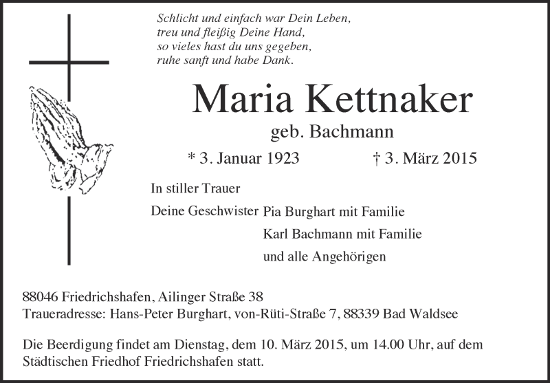 Hier finden Sie alle Traueranzeigen aus der Zeitung, die bisher für Maria Kettnaker erschienen sind. Weitere Traueranzeigen, die in der Zeitung erscheinen, werden hier ebenfalls aufgelistet