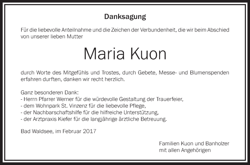 Hier finden Sie alle Traueranzeigen aus der Zeitung, die bisher für Maria Kuon erschienen sind. Weitere Traueranzeigen, die in der Zeitung erscheinen, werden hier ebenfalls aufgelistet