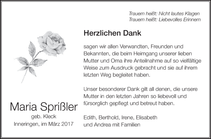 Hier finden Sie alle Traueranzeigen aus der Zeitung, die bisher für Maria Sprißler erschienen sind. Weitere Traueranzeigen, die in der Zeitung erscheinen, werden hier ebenfalls aufgelistet