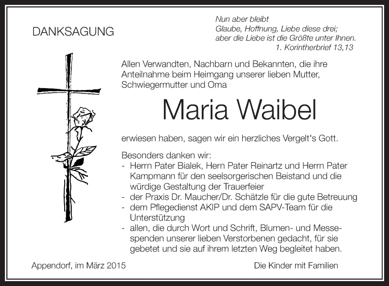 Hier finden Sie alle Traueranzeigen aus der Zeitung, die bisher für Maria Waibel erschienen sind. Weitere Traueranzeigen, die in der Zeitung erscheinen, werden hier ebenfalls aufgelistet