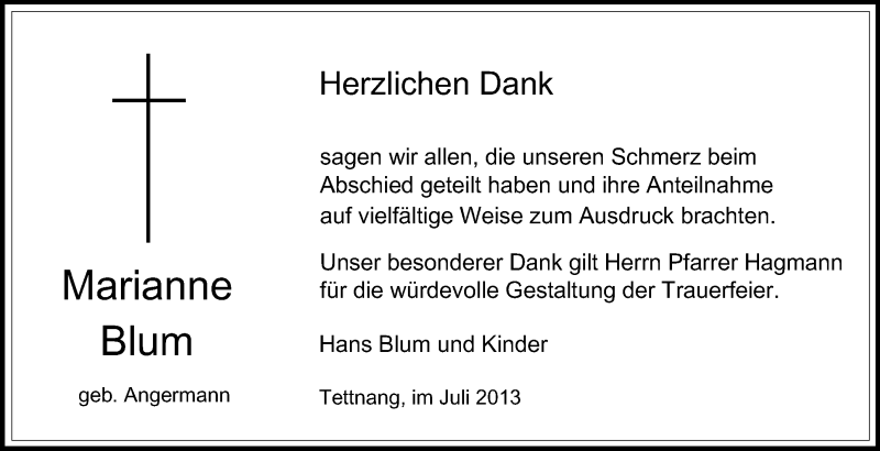 Hier finden Sie alle Traueranzeigen aus der Zeitung, die bisher für Marianne Blum erschienen sind. Weitere Traueranzeigen, die in der Zeitung erscheinen, werden hier ebenfalls aufgelistet