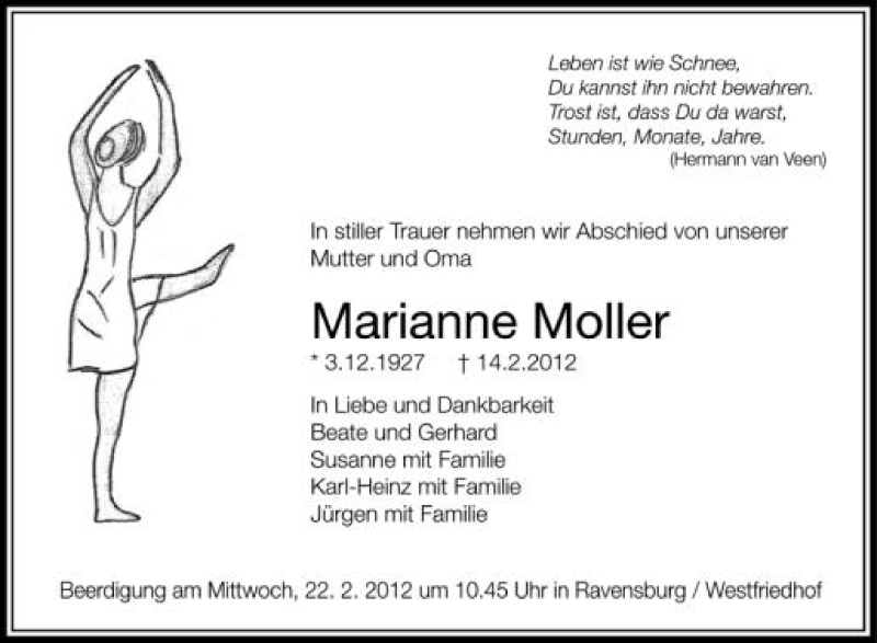 Hier finden Sie alle Traueranzeigen aus der Zeitung, die bisher für Marianne Moller erschienen sind. Weitere Traueranzeigen, die in der Zeitung erscheinen, werden hier ebenfalls aufgelistet