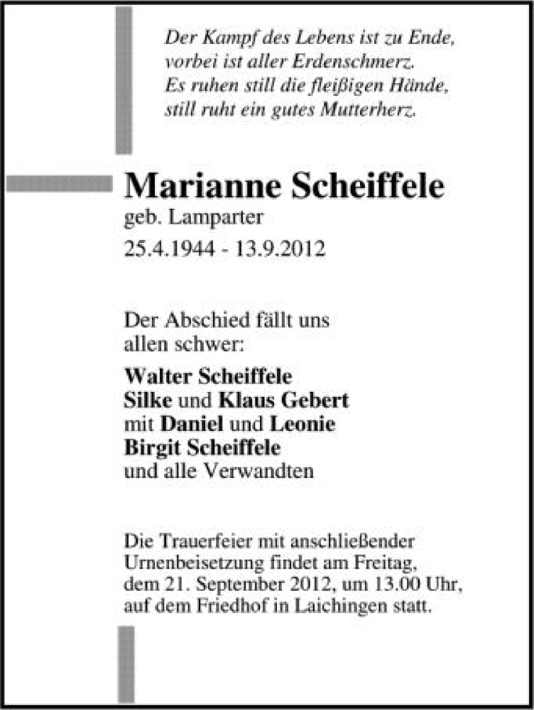 Hier finden Sie alle Traueranzeigen aus der Zeitung, die bisher für Marianne Scheiffele erschienen sind. Weitere Traueranzeigen, die in der Zeitung erscheinen, werden hier ebenfalls aufgelistet